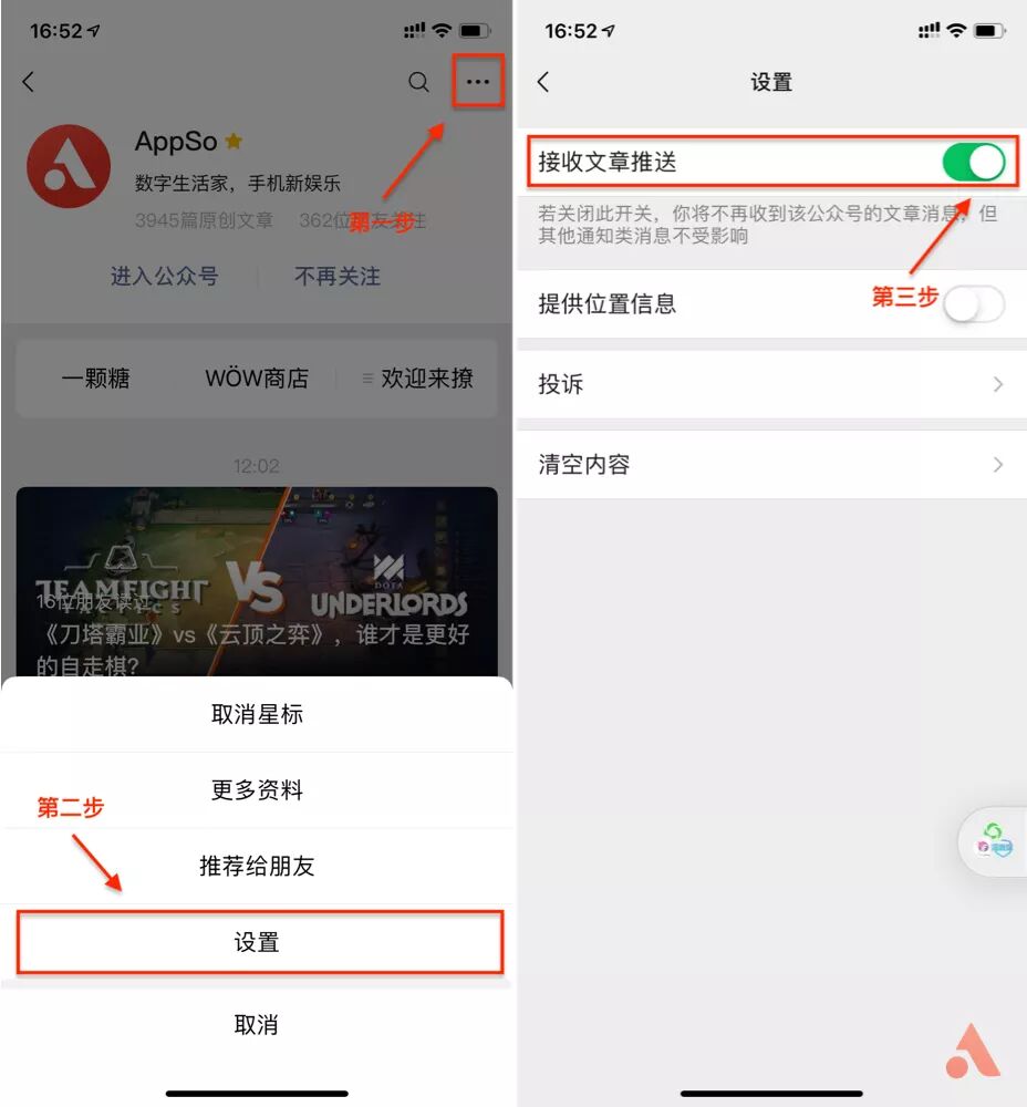 后悔了也可以恢复文章推送有的人在的时候没什么稀奇,但是一旦消失又觉得处处不得劲儿……也许公众号也是这样,如果你在「拒绝接收文章推送」后又后悔了,没关系,你可以重新恢复文章的推送功能。直接在顶部搜索公众号名称,进入公众号主页后点击右上角的「...」-「设置」,打开「接收文章推送」的开关就可以了。最后期待一下,「一键拒收消息」功能来了,「一键清理好友」功能还会远吗?